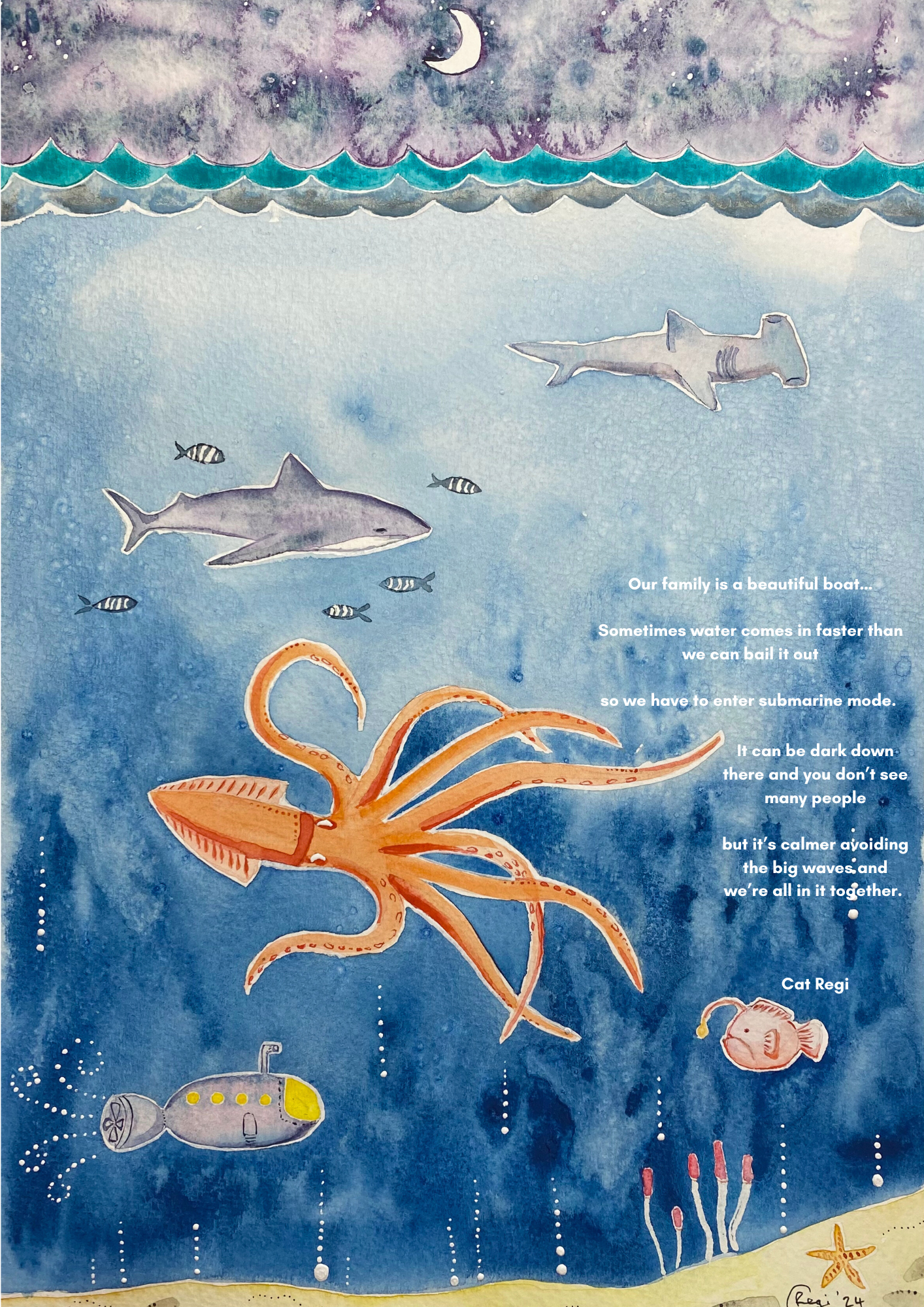I recently wrote a little thing called ‘The Beautiful Boat’ about my experience of living in a family full of neurodivergent members. That print is also available, and this is the essential addition called ‘Submarine Mode’, as the beautiful boat doesn’t always sail on clear waters…