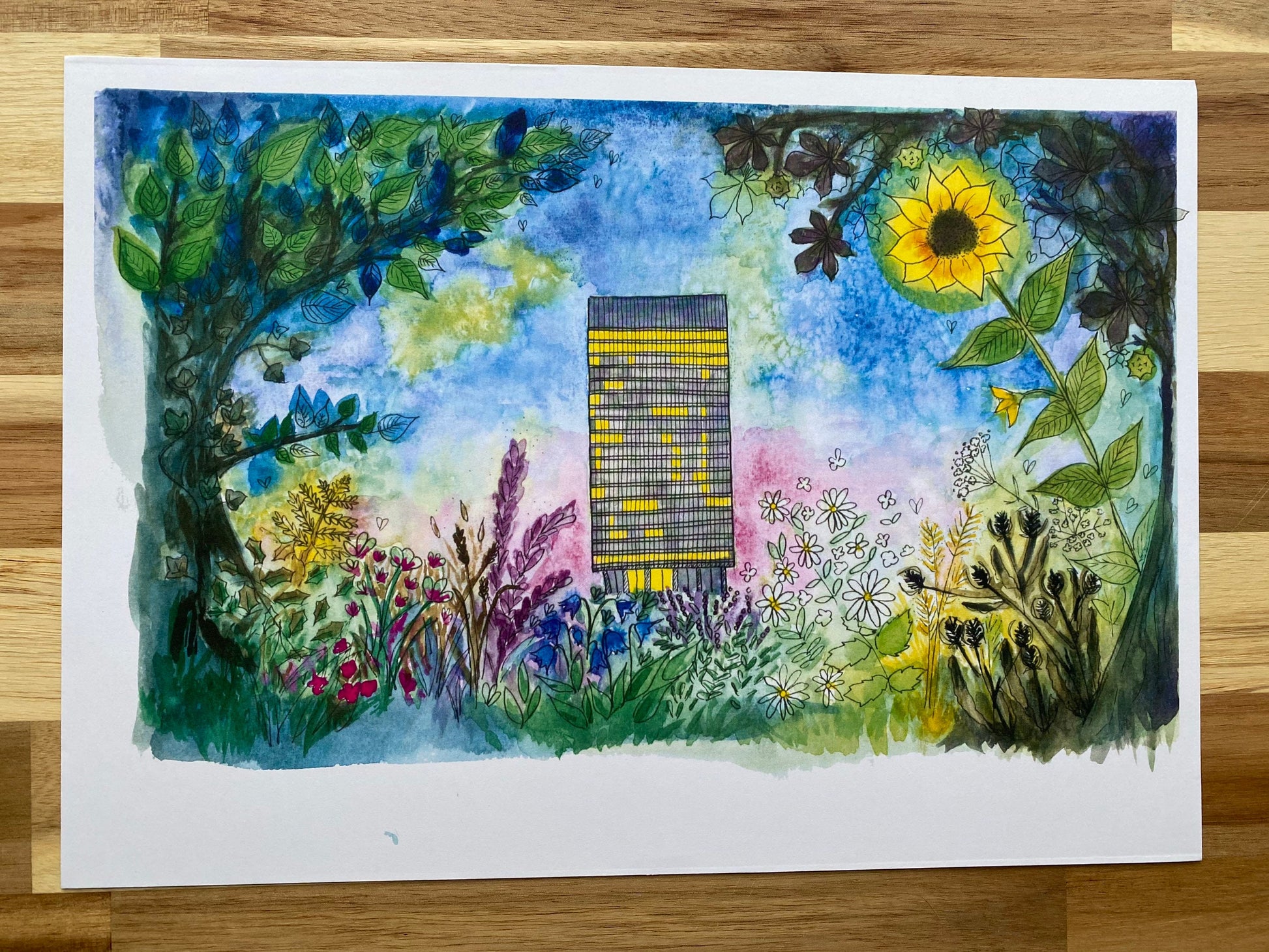 Dusk Arts Tower Sheffield is a single, A3 or A4 print of a watercolour, gouache and ink artwork.