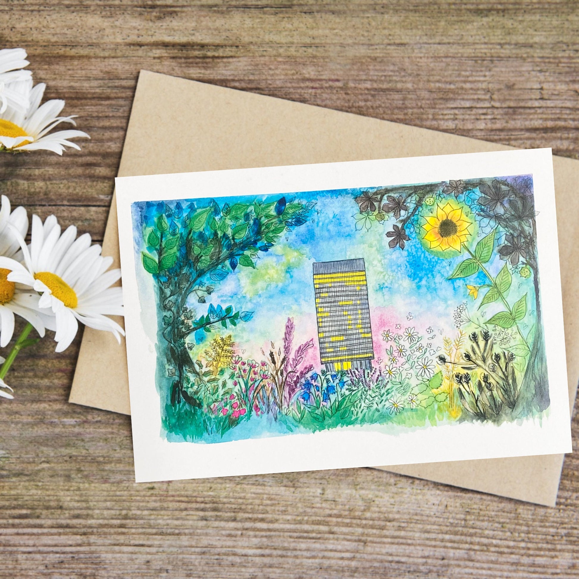 Blank A5 greetings card with a print of a watercolour painting of The Arts Tower in Sheffield. An iconic building, there's even a framed print of this painting in the home of the man who built the famous Paternoster lift inside the building. This is the perfect card for someone who loves Sheffield or is moving to or from there!