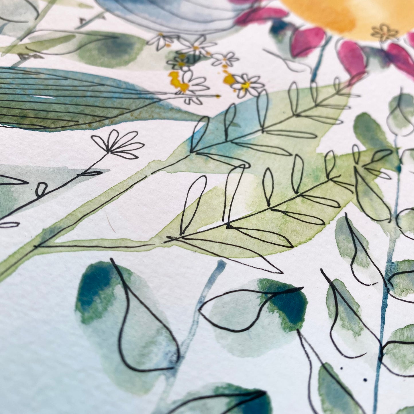 My paintings are created in layers of watercolour, gouache and ink. High-quality paints and 300gsm acid-free paper ensure the colours are vibrant and my experienced print provider has selected the best high gsm paper to reproduce this on so that the colours are matched closely to the original. Please note that some colours may look different on varying computer screens compared to natural light.
