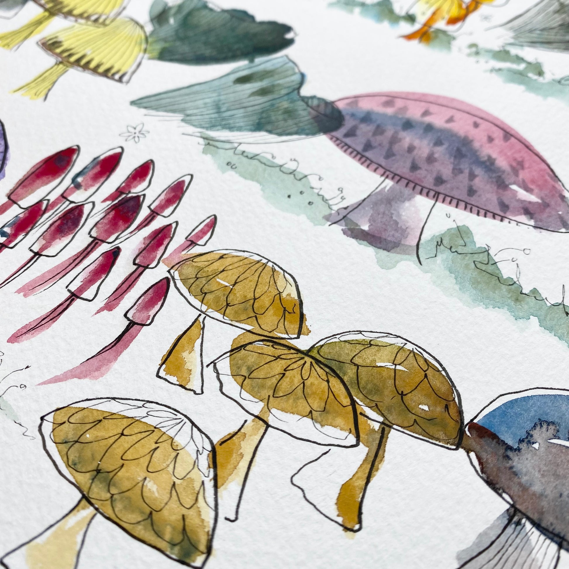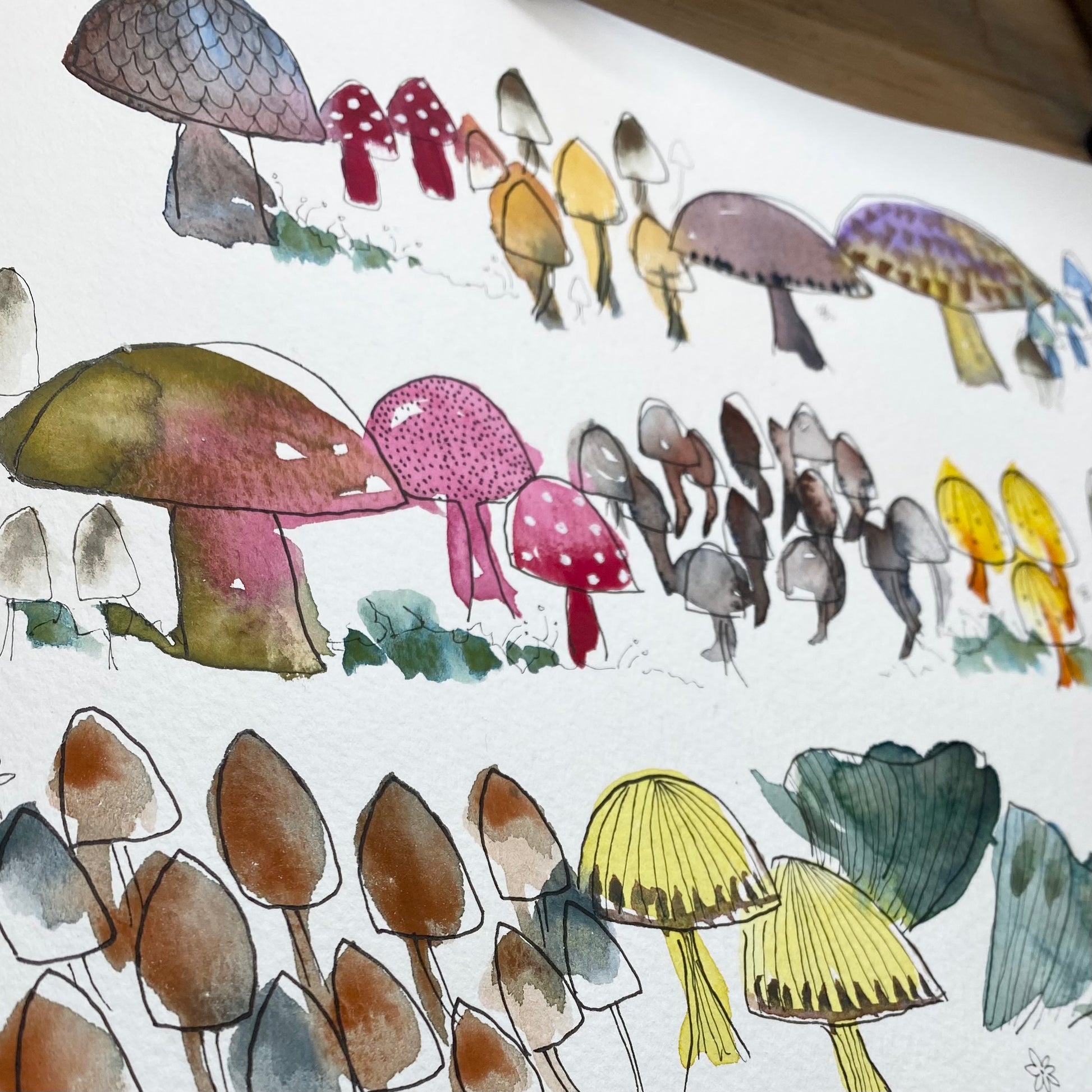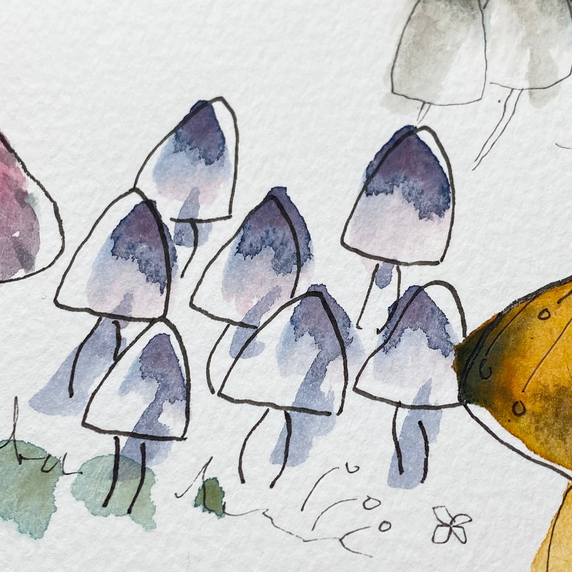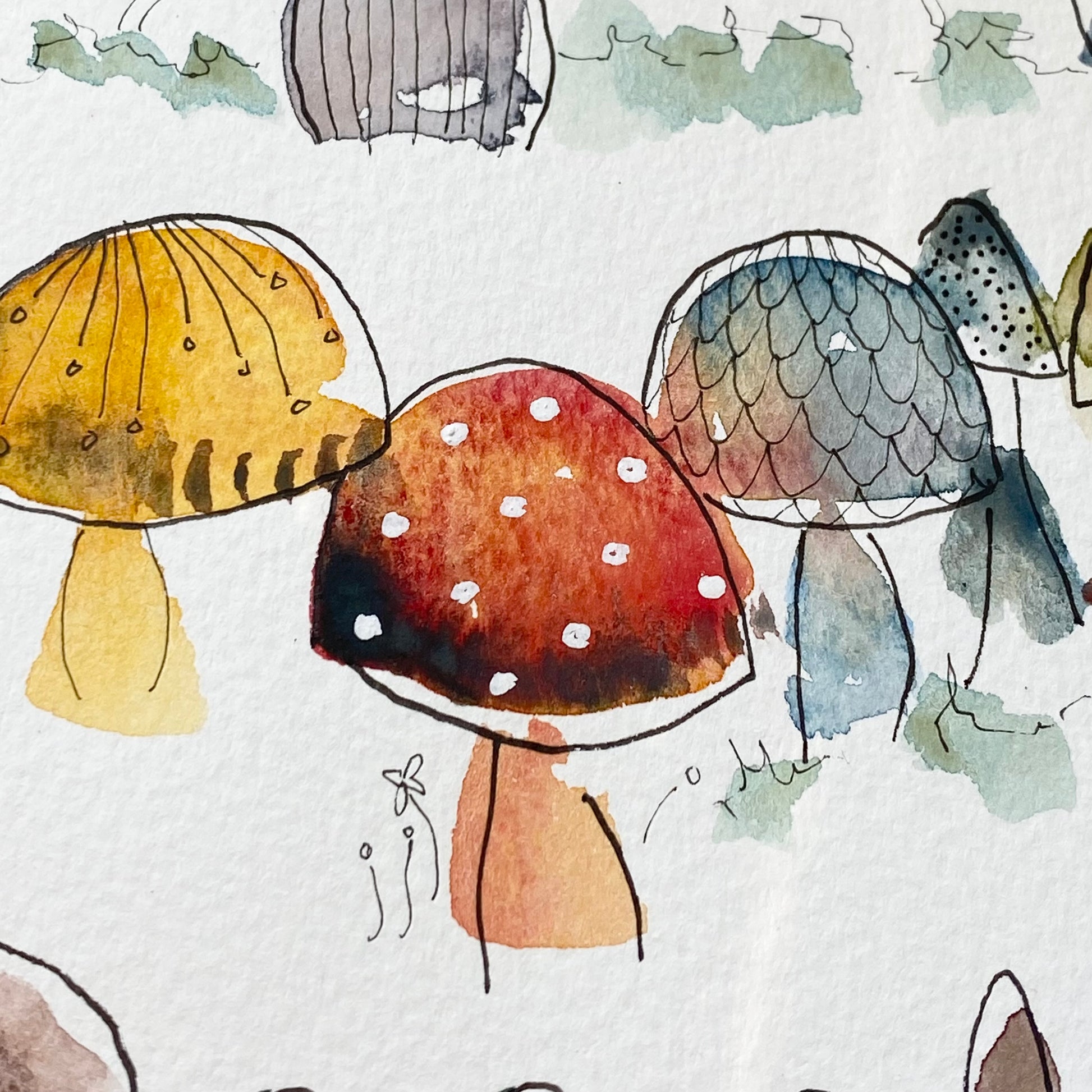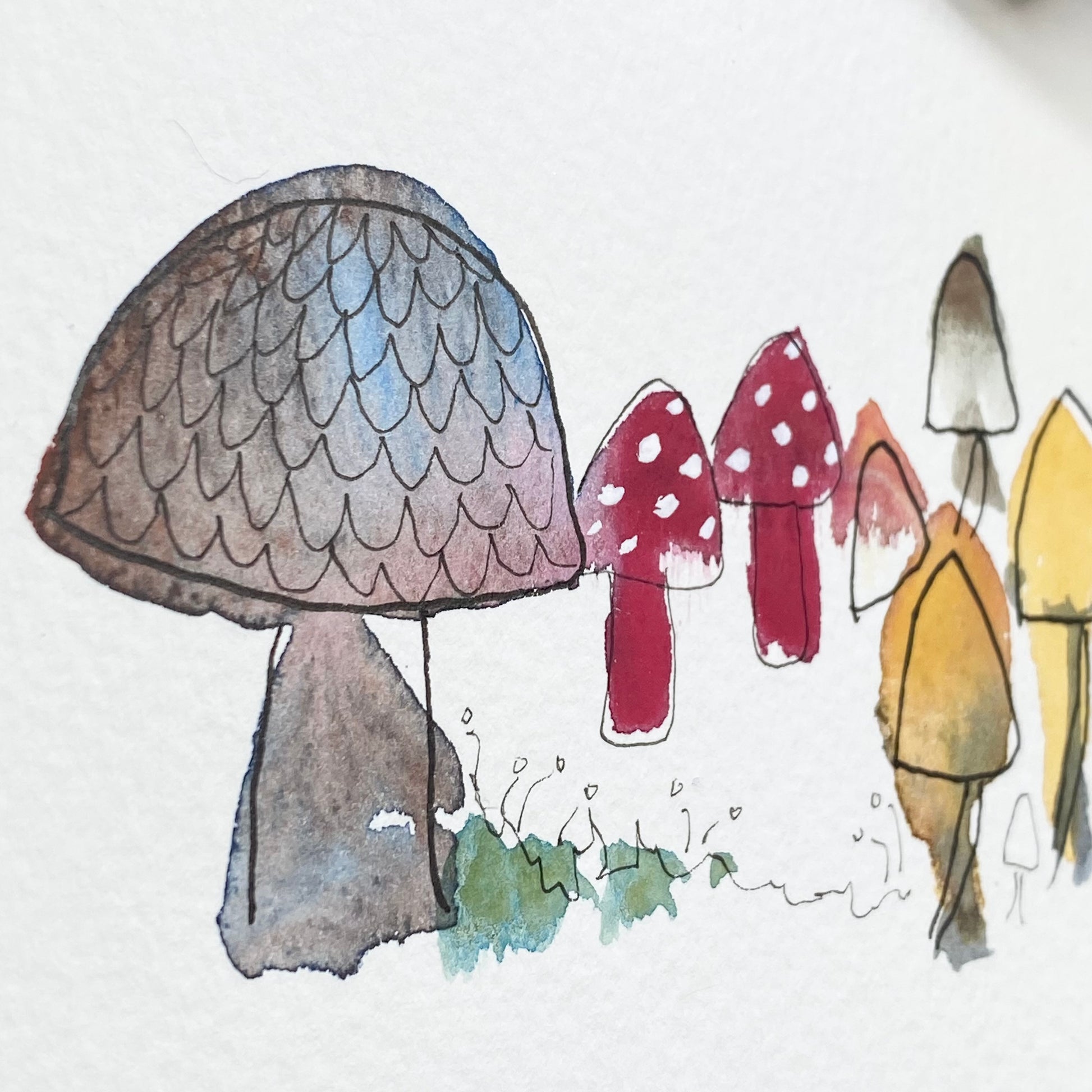 A simple exercise which will gain you experience using your materials and gaining confidence in watercolours. This session will get you blending colours, letting your perfectionist tendencies slide a little as you enjoy the fun of creating lots of shapes of mushrooms. You will use ink to create details and practise creating neutral shades as well as layering colours.